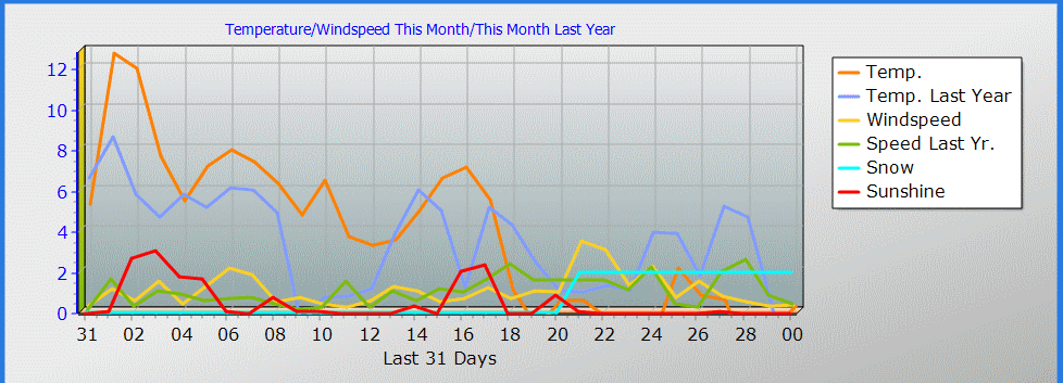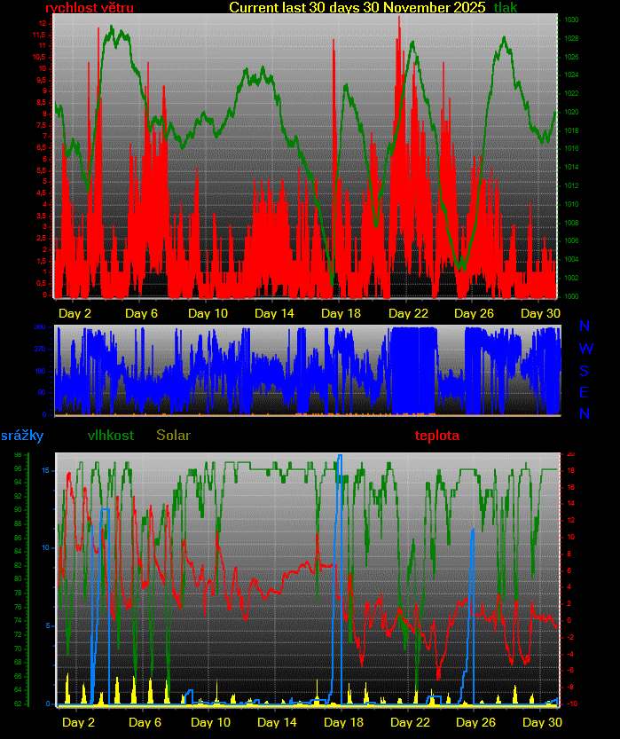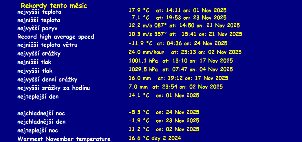 Updated listopad 30 2025 --------------------------------------------------------------------------------------------- prùmìry\maxima v mìsíci listopad 2025 --------------------------------------------------------------------------------------------- prùmìrná teplota = 3.4°C prùmìrná vlhkost = 91% prùmìrný rosný bod = 1.9°C prùmìrný tlak = 1018.3 hPa prùmìrná rychlost vìtru = 1.0 m/s prùmìrný poryv = 2.0 m/s prùmìrný smìr = 84° ( E ) srážky za mìsíc = 54.7 mm srážky za rok = 480.8 mm maximální srážky za minutu = 0.5 mm 02 23:14 maximální teplota = 17.9°C 01 14:14 minimální teplota = -7.1°C 23 19:59 max. vlhkost = 97% 29 03:35 min. vlhkost = 63% 07 14:01 Maximum dewpoint = 12.8°C 01 14:25 Minimum dewpoint = -7.9°C 23 19:51 max. tlak = 1029.5 hPa 04 07:49 min. tlak = 1001.2 hPa 17 13:26 max. rychlost vìtru = 7.2 m/s od 356°( N ) 21 15:43 max. poryv vìtru = 12.4 m/s od 023°(NNE) 21 14:52 max. teplotní index = 17.9°C 01 14:14 Avg daily max temp :6.9°C Avg daily min temp :0.3°C Growing degrees days :0.0 GDD Total windrun = 2614.2km ------------------------------------------ Day, Sunshine hours, ET, max solar, max uv ------------------------------------------ 01 01:42hrs ,ET :0.9 mm ,468.4 W/m2 ,5.0 uv 02 00:00hrs ,ET :0.6 mm ,340.4 W/m2 ,3.0 uv 03 00:06hrs ,ET :0.3 mm ,214.9 W/m2 ,0.0 uv 04 02:42hrs ,ET :1.0 mm ,341.0 W/m2 ,3.0 uv 05 03:06hrs ,ET :1.2 mm ,342.8 W/m2 ,3.0 uv 06 01:48hrs ,ET :1.4 mm ,329.2 W/m2 ,3.0 uv 07 01:42hrs ,ET :1.1 mm ,340.2 W/m2 ,3.0 uv 08 00:06hrs ,ET :0.3 mm ,212.2 W/m2 ,0.0 uv 09 00:00hrs ,ET :0.1 mm ,79.1 W/m2 ,0.0 uv 10 00:48hrs ,ET :0.4 mm ,451.1 W/m2 ,5.0 uv 11 00:06hrs ,ET :0.3 mm ,207.4 W/m2 ,0.0 uv 12 00:06hrs ,ET :0.2 mm ,114.4 W/m2 ,0.0 uv 13 00:00hrs ,ET :0.1 mm ,51.1 W/m2 ,0.0 uv 14 00:00hrs ,ET :0.2 mm ,72.3 W/m2 ,0.0 uv 15 00:00hrs ,ET :0.2 mm ,62.8 W/m2 ,0.0 uv 16 00:24hrs ,ET :0.4 mm ,380.3 W/m2 ,3.0 uv 17 00:00hrs ,ET :0.1 mm ,37.6 W/m2 ,0.0 uv 18 02:06hrs ,ET :0.4 mm ,363.9 W/m2 ,3.0 uv 19 02:24hrs ,ET :0.3 mm ,298.8 W/m2 ,2.0 uv 20 00:00hrs ,ET :0.2 mm ,270.0 W/m2 ,2.0 uv 21 00:00hrs ,ET :0.6 mm ,151.9 W/m2 ,0.0 uv 22 00:54hrs ,ET :0.9 mm ,307.9 W/m2 ,2.0 uv 23 00:06hrs ,ET :0.3 mm ,205.2 W/m2 ,0.0 uv 24 00:00hrs ,ET :0.3 mm ,200.6 W/m2 ,0.0 uv 25 00:00hrs ,ET :0.2 mm ,61.7 W/m2 ,0.0 uv 26 00:00hrs ,ET :0.2 mm ,160.8 W/m2 ,0.0 uv 27 00:00hrs ,ET :0.2 mm ,154.1 W/m2 ,0.0 uv 28 00:00hrs ,ET :0.3 mm ,242.5 W/m2 ,2.0 uv 29 00:06hrs ,ET :0.2 mm ,237.8 W/m2 ,2.0 uv 30 00:00hrs ,ET :0.1 mm ,55.0 W/m2 ,0.0 uv Sunshine hours month to date= 17:57 hrs Sunshine hours year to date= 684:59 hrs Frost days= 12 ----------------------------------- celkové denní srážky ----------------------------------- 11.5 mm 2 12.5 mm 3 00.9 mm 8 00.1 mm 9 00.1 mm 10 00.1 mm 11 00.3 mm 12 00.4 mm 14 00.1 mm 15 00.3 mm 16 16.0 mm 17 00.1 mm 19 00.5 mm 23 11.3 mm 25 00.3 mm 30 All Time Records to date Record high temperature: 39.4 oC at: 18:17 on: 16 May 2007 Record low temperature: -18.5 oC at: 08:32 on: 07 Jan 2017 Record high wind gust : 38.3 m/s od 236o at: 16:37 on: 01 Sep 2018 Record high average speed:17.5 m/s od 028o at: 23:10 on: 15 Aug 2008 Record high rain rate: 12.0 mm/min at: 04:05 on: 28 Jun 2022 Record low barometer: 983.4 mb at: 04:00 on: 14 Apr 2024 Record high barometer: 1046.0 mb at: 23:30 on: 16 Feb 2019 Record daily rain: 118.4 mm at: 16:59 on: 21 Jun 2015 Record rain in 1 hour: 61.7 mm at: 18:04 on: 21 Jun 2007 Record low wind chill temperature: -66.8 oC at: 18:07 on: 30 Sep 2019 Warmest day on record 36.9 oC on: 21 Jul 2022 Coldest night on record -12.6 oC on: 01 Mar 2018 Coldest day on record -9.5 oC at: 18:00 on: 27 Feb 2018 Warmest night on record 28.0 oC on: 02 Aug 2017 Warmest November temperature: 17.9 oC 2025 Coldest November temperature: -7.1 oC 2025