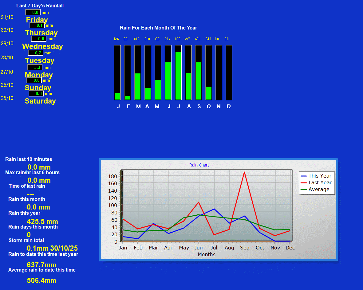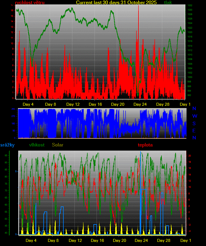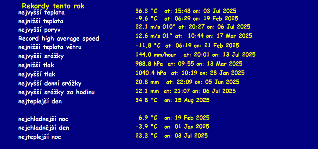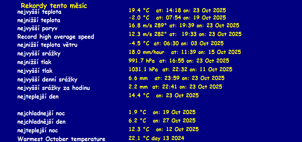 Updated Říjen 31 2025 --------------------------------------------------------------------------------------------- prùmìry\maxima v mìsíci øíjen 2025 --------------------------------------------------------------------------------------------- prùmìrná teplota = 9.0°C prùmìrná vlhkost = 80% prùmìrný rosný bod = 5.6°C prùmìrný tlak = 1018.2 hPa prùmìrná rychlost vìtru = 1.2 m/s prùmìrný poryv = 2.4 m/s prùmìrný smìr = 296° (WNW) srážky za mìsíc = 24.0 mm srážky za rok = 426.1 mm maximální srážky za minutu = 0.2 mm 15 11:40 maximální teplota = 19.4°C 23 14:21 minimální teplota = -2.0°C 19 08:03 max. vlhkost = 97% 30 07:45 min. vlhkost = 40% 03 16:12 Maximum dewpoint = 14.0°C 09 15:21 Minimum dewpoint = -3.1°C 19 7:56 max. tlak = 1031.1 hPa 11 22:56 min. tlak = 991.7 hPa 23 17:01 max. rychlost vìtru = 8.7 m/s od 296°(WNW) 23 19:41 max. poryv vìtru = 17.0 m/s od 338°(NNW) 23 19:42 max. teplotní index = 19.4°C 23 14:21 Avg daily max temp :14.2°C Avg daily min temp :4.5°C Growing degrees days :66.3 GDD Corn growing degrees days :0.0 GDD Total windrun = 3312.1km ------------------------------------------ Day, Sunshine hours, ET, max solar, max uv ------------------------------------------ 01 00:42hrs ,ET :1.6 mm ,639.0 W/m2 ,7.0 uv 02 02:48hrs ,ET :1.8 mm ,645.9 W/m2 ,8.0 uv 03 04:24hrs ,ET :2.4 mm ,523.2 W/m2 ,5.0 uv 04 04:24hrs ,ET :1.9 mm ,604.7 W/m2 ,7.0 uv 05 00:06hrs ,ET :1.1 mm ,587.1 W/m2 ,7.0 uv 06 00:00hrs ,ET :0.7 mm ,297.8 W/m2 ,2.0 uv 07 00:36hrs ,ET :1.3 mm ,701.5 W/m2 ,8.0 uv 08 04:54hrs ,ET :1.4 mm ,539.5 W/m2 ,7.0 uv 09 00:00hrs ,ET :0.5 mm ,158.6 W/m2 ,0.0 uv 10 00:12hrs ,ET :1.0 mm ,680.0 W/m2 ,8.0 uv 11 00:00hrs ,ET :1.0 mm ,504.8 W/m2 ,5.0 uv 12 00:00hrs ,ET :1.0 mm ,358.1 W/m2 ,3.0 uv 13 00:48hrs ,ET :1.0 mm ,551.1 W/m2 ,7.0 uv 14 01:06hrs ,ET :1.0 mm ,508.6 W/m2 ,5.0 uv 15 00:00hrs ,ET :0.5 mm ,608.6 W/m2 ,7.0 uv 16 03:06hrs ,ET :1.1 mm ,598.4 W/m2 ,7.0 uv 17 00:06hrs ,ET :0.8 mm ,638.1 W/m2 ,7.0 uv 18 04:12hrs ,ET :1.5 mm ,586.4 W/m2 ,7.0 uv 19 03:30hrs ,ET :1.1 mm ,447.6 W/m2 ,5.0 uv 20 03:42hrs ,ET :1.9 mm ,425.4 W/m2 ,3.0 uv 21 00:06hrs ,ET :1.8 mm ,425.3 W/m2 ,3.0 uv 22 00:18hrs ,ET :1.1 mm ,387.6 W/m2 ,3.0 uv 23 01:54hrs ,ET :1.8 mm ,520.2 W/m2 ,5.0 uv 24 01:12hrs ,ET :1.1 mm ,563.6 W/m2 ,7.0 uv 25 00:42hrs ,ET :0.8 mm ,564.9 W/m2 ,7.0 uv 26 01:18hrs ,ET :1.1 mm ,489.1 W/m2 ,5.0 uv 27 00:06hrs ,ET :0.5 mm ,130.8 W/m2 ,0.0 uv 28 01:00hrs ,ET :0.9 mm ,460.6 W/m2 ,5.0 uv 29 01:42hrs ,ET :1.6 mm ,392.4 W/m2 ,3.0 uv 30 00:18hrs ,ET :0.7 mm ,391.9 W/m2 ,3.0 uv 31 01:12hrs ,ET :0.9 mm ,417.8 W/m2 ,3.0 uv Sunshine hours month to date= 44:09 hrs Sunshine hours year to date= 667:02 hrs Frost days= 4 ----------------------------------- celkové denní srážky ----------------------------------- 02.5 mm 4 00.2 mm 5 01.8 mm 6 00.1 mm 7 00.2 mm 8 02.2 mm 9 00.2 mm 14 00.8 mm 15 00.2 mm 17 06.5 mm 23 03.6 mm 24 01.5 mm 25 03.3 mm 27 00.7 mm 28 00.1 mm 30 All Time Records to date Record high temperature: 39.4 oC at: 18:17 on: 16 May 2007 Record low temperature: -18.5 oC at: 08:32 on: 07 Jan 2017 Record high wind gust : 38.3 m/s od 236o at: 16:37 on: 01 Sep 2018 Record high average speed:17.5 m/s od 028o at: 23:10 on: 15 Aug 2008 Record high rain rate: 12.0 mm/min at: 04:05 on: 28 Jun 2022 Record low barometer: 983.4 mb at: 04:00 on: 14 Apr 2024 Record high barometer: 1046.0 mb at: 23:30 on: 16 Feb 2019 Record daily rain: 118.4 mm at: 16:59 on: 21 Jun 2015 Record rain in 1 hour: 61.7 mm at: 18:04 on: 21 Jun 2007 Record low wind chill temperature: -66.8 oC at: 18:07 on: 30 Sep 2019 Warmest day on record 36.9 oC on: 21 Jul 2022 Coldest night on record -12.6 oC on: 01 Mar 2018 Coldest day on record -9.5 oC at: 18:00 on: 27 Feb 2018 Warmest night on record 28.0 oC on: 02 Aug 2017 Warmest October temperature: 19.4 oC Coldest October temperature: -2.0 oC