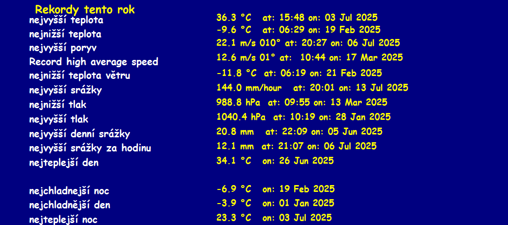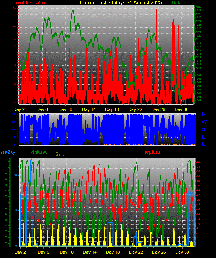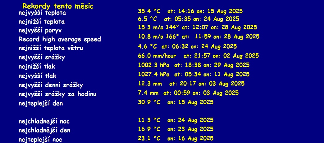 Updated srpen 31 2025 --------------------------------------------------------------------------------------------- prùmìry\maxima v mìsíci srpen 2025 --------------------------------------------------------------------------------------------- prùmìrná teplota = 20.2°C prùmìrná vlhkost = 64% prùmìrný rosný bod = 12.4°C prùmìrný tlak = 1016.0 hPa prùmìrná rychlost vìtru = 1.2 m/s prùmìrný poryv = 2.3 m/s prùmìrný smìr = 13° (NNE) srážky za mìsíc = 49.7 mm srážky za rok = 332.4 mm maximální srážky za minutu = 0.9 mm 02 21:58 maximální teplota = 35.4°C 15 16:23 minimální teplota = 6.5°C 24 06:49 max. vlhkost = 96% 31 06:28 min. vlhkost = 24% 24 16:37 Maximum dewpoint = 20.1°C 10 09:49 Minimum dewpoint = 0.7°C 24 16:26 max. tlak = 1027.4 hPa 11 05:59 min. tlak = 1002.3 hPa 29 18:40 max. rychlost vìtru = 7.2 m/s od 203°(SSW) 28 15:38 max. poryv vìtru = 15.4 m/s od 113°(ESE) 28 12:09 max. teplotní index = 36.0°C 15 14:20 Avg daily max temp = 27.7°C Avg daily min temp = 13.2°C Growing degrees days =313.6 GDD Corn growing degree days=874.9 GDD Total windrun = 3268.2km ------------------------------------------ Day, Sunshine hours, ET, max solar, max uv ------------------------------------------ 01 02:00hrs ,ET :3.4 mm ,904.2 W/m2 ,12.0 uv 02 06:00hrs ,ET :4.4 mm ,852.6 W/m2 ,10.0 uv 03 00:36hrs ,ET :2.7 mm ,971.0 W/m2 ,14.0 uv 04 03:24hrs ,ET :3.2 mm ,977.7 W/m2 ,14.0 uv 05 06:48hrs ,ET :4.3 mm ,777.7 W/m2 ,10.0 uv 06 05:12hrs ,ET :4.4 mm ,837.7 W/m2 ,10.0 uv 07 04:48hrs ,ET :4.4 mm ,777.9 W/m2 ,10.0 uv 08 06:24hrs ,ET :5.9 mm ,761.9 W/m2 ,10.0 uv 09 06:06hrs ,ET :5.6 mm ,778.1 W/m2 ,10.0 uv 10 03:42hrs ,ET :6.2 mm ,883.5 W/m2 ,12.0 uv 11 07:12hrs ,ET :5.7 mm ,756.8 W/m2 ,10.0 uv 12 07:12hrs ,ET :4.5 mm ,759.3 W/m2 ,10.0 uv 13 05:12hrs ,ET :6.3 mm ,729.4 W/m2 ,8.0 uv 14 03:48hrs ,ET :6.2 mm ,702.5 W/m2 ,8.0 uv 15 05:00hrs ,ET :5.6 mm ,716.7 W/m2 ,8.0 uv 16 01:24hrs ,ET :5.1 mm ,782.6 W/m2 ,10.0 uv 17 04:12hrs ,ET :4.9 mm ,853.7 W/m2 ,10.0 uv 18 04:30hrs ,ET :5.0 mm ,876.9 W/m2 ,12.0 uv 19 07:12hrs ,ET :4.4 mm ,734.2 W/m2 ,8.0 uv 20 05:48hrs ,ET :4.3 mm ,731.2 W/m2 ,8.0 uv 21 00:00hrs ,ET :1.6 mm ,243.5 W/m2 ,2.0 uv 22 03:06hrs ,ET :4.2 mm ,883.3 W/m2 ,12.0 uv 23 00:54hrs ,ET :3.2 mm ,873.4 W/m2 ,12.0 uv 24 06:24hrs ,ET :3.8 mm ,783.4 W/m2 ,10.0 uv 25 05:24hrs ,ET :3.9 mm ,898.3 W/m2 ,12.0 uv 26 04:18hrs ,ET :3.8 mm ,724.6 W/m2 ,8.0 uv 27 01:12hrs ,ET :2.9 mm ,637.5 W/m2 ,7.0 uv 28 04:18hrs ,ET :6.8 mm ,766.8 W/m2 ,10.0 uv 29 03:06hrs ,ET :4.5 mm ,822.0 W/m2 ,10.0 uv 30 02:36hrs ,ET :3.0 mm ,743.2 W/m2 ,8.0 uv 31 00:00hrs ,ET :1.7 mm ,679.7 W/m2 ,8.0 uv Sunshine hours month to date= 127:32 hrs Sunshine hours year to date= 538:56 hrs ----------------------------------- celkové denní srážky ----------------------------------- 07.4 mm 1 08.3 mm 2 12.3 mm 3 00.3 mm 4 03.3 mm 17 02.0 mm 21 00.5 mm 22 00.2 mm 29 07.7 mm 30 07.5 mm 31 All Time Records to date Record high temperature: 39.4 oC at: 18:17 on: 16 May 2007 Record low temperature: -18.5 oC at: 08:32 on: 07 Jan 2017 Record high wind gust : 38.3 m/s od 236o at: 16:37 on: 01 Sep 2018 Record high average speed:17.5 m/s od 028o at: 23:10 on: 15 Aug 2008 Record high rain rate: 12.0 mm/min at: 04:05 on: 28 Jun 2022 Record low barometer: 983.4 mb at: 04:00 on: 14 Apr 2024 Record high barometer: 1046.0 mb at: 23:30 on: 16 Feb 2019 Record daily rain: 118.4 mm at: 16:59 on: 21 Jun 2015 Record rain in 1 hour: 61.7 mm at: 18:04 on: 21 Jun 2007 Record low wind chill temperature: -66.8 oC at: 18:07 on: 30 Sep 2019 Warmest day on record 36.9 oC on: 21 Jul 2022 Coldest night on record -12.6 oC on: 01 Mar 2018 Coldest day on record -9.5 oC at: 18:00 on: 27 Feb 2018 Warmest night on record 28.0 oC on: 02 Aug 2017 Warmest August temperature: 38.2 oC 2024 Coldest August temperature: 6.5 oC 2025