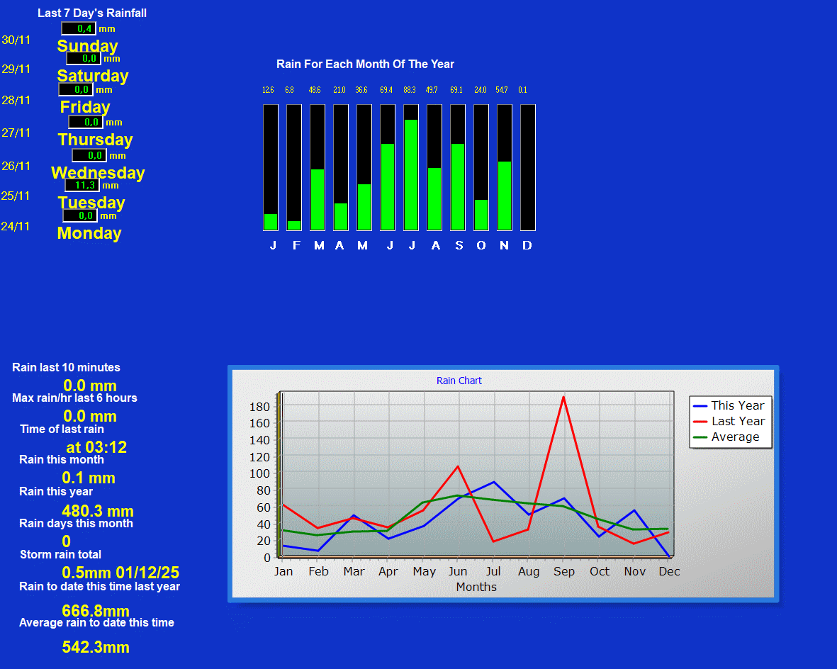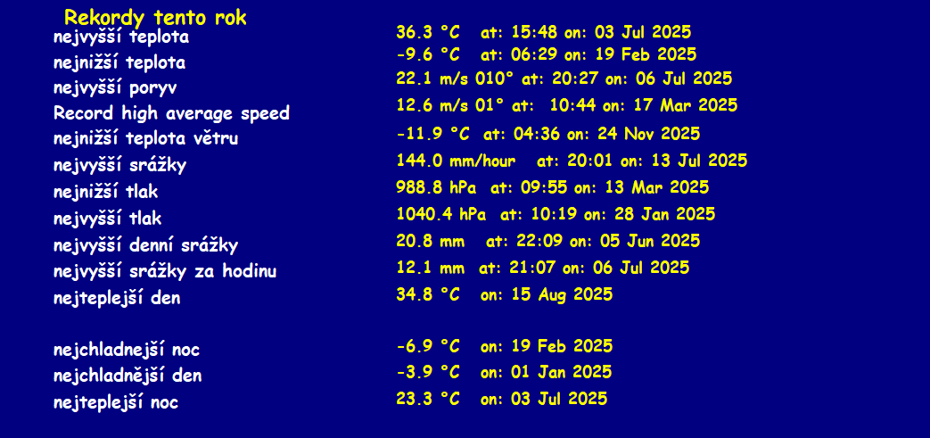 Updated listopad 30 2025 --------------------------------------------------------------------------------------------- prùmìry\maxima v mìsíci listopad 2025 --------------------------------------------------------------------------------------------- prùmìrná teplota = 3.4°C prùmìrná vlhkost = 91% prùmìrný rosný bod = 1.9°C prùmìrný tlak = 1018.3 hPa prùmìrná rychlost vìtru = 1.0 m/s prùmìrný poryv = 2.0 m/s prùmìrný smìr = 84° ( E ) srážky za mìsíc = 54.7 mm srážky za rok = 480.8 mm maximální srážky za minutu = 0.5 mm 02 23:14 maximální teplota = 17.9°C 01 14:14 minimální teplota = -7.1°C 23 19:59 max. vlhkost = 97% 29 03:35 min. vlhkost = 63% 07 14:01 Maximum dewpoint = 12.8°C 01 14:25 Minimum dewpoint = -7.9°C 23 19:51 max. tlak = 1029.5 hPa 04 07:49 min. tlak = 1001.2 hPa 17 13:26 max. rychlost vìtru = 7.2 m/s od 356°( N ) 21 15:43 max. poryv vìtru = 12.4 m/s od 023°(NNE) 21 14:52 max. teplotní index = 17.9°C 01 14:14 Avg daily max temp :6.9°C Avg daily min temp :0.3°C Growing degrees days :0.0 GDD Total windrun = 2614.2km ------------------------------------------ Day, Sunshine hours, ET, max solar, max uv ------------------------------------------ 01 01:42hrs ,ET :0.9 mm ,468.4 W/m2 ,5.0 uv 02 00:00hrs ,ET :0.6 mm ,340.4 W/m2 ,3.0 uv 03 00:06hrs ,ET :0.3 mm ,214.9 W/m2 ,0.0 uv 04 02:42hrs ,ET :1.0 mm ,341.0 W/m2 ,3.0 uv 05 03:06hrs ,ET :1.2 mm ,342.8 W/m2 ,3.0 uv 06 01:48hrs ,ET :1.4 mm ,329.2 W/m2 ,3.0 uv 07 01:42hrs ,ET :1.1 mm ,340.2 W/m2 ,3.0 uv 08 00:06hrs ,ET :0.3 mm ,212.2 W/m2 ,0.0 uv 09 00:00hrs ,ET :0.1 mm ,79.1 W/m2 ,0.0 uv 10 00:48hrs ,ET :0.4 mm ,451.1 W/m2 ,5.0 uv 11 00:06hrs ,ET :0.3 mm ,207.4 W/m2 ,0.0 uv 12 00:06hrs ,ET :0.2 mm ,114.4 W/m2 ,0.0 uv 13 00:00hrs ,ET :0.1 mm ,51.1 W/m2 ,0.0 uv 14 00:00hrs ,ET :0.2 mm ,72.3 W/m2 ,0.0 uv 15 00:00hrs ,ET :0.2 mm ,62.8 W/m2 ,0.0 uv 16 00:24hrs ,ET :0.4 mm ,380.3 W/m2 ,3.0 uv 17 00:00hrs ,ET :0.1 mm ,37.6 W/m2 ,0.0 uv 18 02:06hrs ,ET :0.4 mm ,363.9 W/m2 ,3.0 uv 19 02:24hrs ,ET :0.3 mm ,298.8 W/m2 ,2.0 uv 20 00:00hrs ,ET :0.2 mm ,270.0 W/m2 ,2.0 uv 21 00:00hrs ,ET :0.6 mm ,151.9 W/m2 ,0.0 uv 22 00:54hrs ,ET :0.9 mm ,307.9 W/m2 ,2.0 uv 23 00:06hrs ,ET :0.3 mm ,205.2 W/m2 ,0.0 uv 24 00:00hrs ,ET :0.3 mm ,200.6 W/m2 ,0.0 uv 25 00:00hrs ,ET :0.2 mm ,61.7 W/m2 ,0.0 uv 26 00:00hrs ,ET :0.2 mm ,160.8 W/m2 ,0.0 uv 27 00:00hrs ,ET :0.2 mm ,154.1 W/m2 ,0.0 uv 28 00:00hrs ,ET :0.3 mm ,242.5 W/m2 ,2.0 uv 29 00:06hrs ,ET :0.2 mm ,237.8 W/m2 ,2.0 uv 30 00:00hrs ,ET :0.1 mm ,55.0 W/m2 ,0.0 uv Sunshine hours month to date= 17:57 hrs Sunshine hours year to date= 684:59 hrs Frost days= 12 ----------------------------------- celkové denní srážky ----------------------------------- 11.5 mm 2 12.5 mm 3 00.9 mm 8 00.1 mm 9 00.1 mm 10 00.1 mm 11 00.3 mm 12 00.4 mm 14 00.1 mm 15 00.3 mm 16 16.0 mm 17 00.1 mm 19 00.5 mm 23 11.3 mm 25 00.3 mm 30 All Time Records to date Record high temperature: 39.4 oC at: 18:17 on: 16 May 2007 Record low temperature: -18.5 oC at: 08:32 on: 07 Jan 2017 Record high wind gust : 38.3 m/s od 236o at: 16:37 on: 01 Sep 2018 Record high average speed:17.5 m/s od 028o at: 23:10 on: 15 Aug 2008 Record high rain rate: 12.0 mm/min at: 04:05 on: 28 Jun 2022 Record low barometer: 983.4 mb at: 04:00 on: 14 Apr 2024 Record high barometer: 1046.0 mb at: 23:30 on: 16 Feb 2019 Record daily rain: 118.4 mm at: 16:59 on: 21 Jun 2015 Record rain in 1 hour: 61.7 mm at: 18:04 on: 21 Jun 2007 Record low wind chill temperature: -66.8 oC at: 18:07 on: 30 Sep 2019 Warmest day on record 36.9 oC on: 21 Jul 2022 Coldest night on record -12.6 oC on: 01 Mar 2018 Coldest day on record -9.5 oC at: 18:00 on: 27 Feb 2018 Warmest night on record 28.0 oC on: 02 Aug 2017 Warmest November temperature: 17.9 oC 2025 Coldest November temperature: -7.1 oC 2025