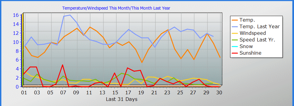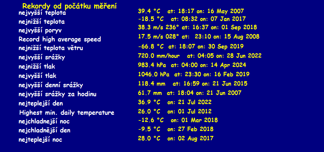 Updated Říjen 31 2025 --------------------------------------------------------------------------------------------- prùmìry\maxima v mìsíci øíjen 2025 --------------------------------------------------------------------------------------------- prùmìrná teplota = 9.0°C prùmìrná vlhkost = 80% prùmìrný rosný bod = 5.6°C prùmìrný tlak = 1018.2 hPa prùmìrná rychlost vìtru = 1.2 m/s prùmìrný poryv = 2.4 m/s prùmìrný smìr = 296° (WNW) srážky za mìsíc = 24.0 mm srážky za rok = 426.1 mm maximální srážky za minutu = 0.2 mm 15 11:40 maximální teplota = 19.4°C 23 14:21 minimální teplota = -2.0°C 19 08:03 max. vlhkost = 97% 30 07:45 min. vlhkost = 40% 03 16:12 Maximum dewpoint = 14.0°C 09 15:21 Minimum dewpoint = -3.1°C 19 7:56 max. tlak = 1031.1 hPa 11 22:56 min. tlak = 991.7 hPa 23 17:01 max. rychlost vìtru = 8.7 m/s od 296°(WNW) 23 19:41 max. poryv vìtru = 17.0 m/s od 338°(NNW) 23 19:42 max. teplotní index = 19.4°C 23 14:21 Avg daily max temp :14.2°C Avg daily min temp :4.5°C Growing degrees days :66.3 GDD Corn growing degrees days :0.0 GDD Total windrun = 3312.1km ------------------------------------------ Day, Sunshine hours, ET, max solar, max uv ------------------------------------------ 01 00:42hrs ,ET :1.6 mm ,639.0 W/m2 ,7.0 uv 02 02:48hrs ,ET :1.8 mm ,645.9 W/m2 ,8.0 uv 03 04:24hrs ,ET :2.4 mm ,523.2 W/m2 ,5.0 uv 04 04:24hrs ,ET :1.9 mm ,604.7 W/m2 ,7.0 uv 05 00:06hrs ,ET :1.1 mm ,587.1 W/m2 ,7.0 uv 06 00:00hrs ,ET :0.7 mm ,297.8 W/m2 ,2.0 uv 07 00:36hrs ,ET :1.3 mm ,701.5 W/m2 ,8.0 uv 08 04:54hrs ,ET :1.4 mm ,539.5 W/m2 ,7.0 uv 09 00:00hrs ,ET :0.5 mm ,158.6 W/m2 ,0.0 uv 10 00:12hrs ,ET :1.0 mm ,680.0 W/m2 ,8.0 uv 11 00:00hrs ,ET :1.0 mm ,504.8 W/m2 ,5.0 uv 12 00:00hrs ,ET :1.0 mm ,358.1 W/m2 ,3.0 uv 13 00:48hrs ,ET :1.0 mm ,551.1 W/m2 ,7.0 uv 14 01:06hrs ,ET :1.0 mm ,508.6 W/m2 ,5.0 uv 15 00:00hrs ,ET :0.5 mm ,608.6 W/m2 ,7.0 uv 16 03:06hrs ,ET :1.1 mm ,598.4 W/m2 ,7.0 uv 17 00:06hrs ,ET :0.8 mm ,638.1 W/m2 ,7.0 uv 18 04:12hrs ,ET :1.5 mm ,586.4 W/m2 ,7.0 uv 19 03:30hrs ,ET :1.1 mm ,447.6 W/m2 ,5.0 uv 20 03:42hrs ,ET :1.9 mm ,425.4 W/m2 ,3.0 uv 21 00:06hrs ,ET :1.8 mm ,425.3 W/m2 ,3.0 uv 22 00:18hrs ,ET :1.1 mm ,387.6 W/m2 ,3.0 uv 23 01:54hrs ,ET :1.8 mm ,520.2 W/m2 ,5.0 uv 24 01:12hrs ,ET :1.1 mm ,563.6 W/m2 ,7.0 uv 25 00:42hrs ,ET :0.8 mm ,564.9 W/m2 ,7.0 uv 26 01:18hrs ,ET :1.1 mm ,489.1 W/m2 ,5.0 uv 27 00:06hrs ,ET :0.5 mm ,130.8 W/m2 ,0.0 uv 28 01:00hrs ,ET :0.9 mm ,460.6 W/m2 ,5.0 uv 29 01:42hrs ,ET :1.6 mm ,392.4 W/m2 ,3.0 uv 30 00:18hrs ,ET :0.7 mm ,391.9 W/m2 ,3.0 uv 31 01:12hrs ,ET :0.9 mm ,417.8 W/m2 ,3.0 uv Sunshine hours month to date= 44:09 hrs Sunshine hours year to date= 667:02 hrs Frost days= 4 ----------------------------------- celkové denní srážky ----------------------------------- 02.5 mm 4 00.2 mm 5 01.8 mm 6 00.1 mm 7 00.2 mm 8 02.2 mm 9 00.2 mm 14 00.8 mm 15 00.2 mm 17 06.5 mm 23 03.6 mm 24 01.5 mm 25 03.3 mm 27 00.7 mm 28 00.1 mm 30 All Time Records to date Record high temperature: 39.4 oC at: 18:17 on: 16 May 2007 Record low temperature: -18.5 oC at: 08:32 on: 07 Jan 2017 Record high wind gust : 38.3 m/s od 236o at: 16:37 on: 01 Sep 2018 Record high average speed:17.5 m/s od 028o at: 23:10 on: 15 Aug 2008 Record high rain rate: 12.0 mm/min at: 04:05 on: 28 Jun 2022 Record low barometer: 983.4 mb at: 04:00 on: 14 Apr 2024 Record high barometer: 1046.0 mb at: 23:30 on: 16 Feb 2019 Record daily rain: 118.4 mm at: 16:59 on: 21 Jun 2015 Record rain in 1 hour: 61.7 mm at: 18:04 on: 21 Jun 2007 Record low wind chill temperature: -66.8 oC at: 18:07 on: 30 Sep 2019 Warmest day on record 36.9 oC on: 21 Jul 2022 Coldest night on record -12.6 oC on: 01 Mar 2018 Coldest day on record -9.5 oC at: 18:00 on: 27 Feb 2018 Warmest night on record 28.0 oC on: 02 Aug 2017 Warmest October temperature: 19.4 oC Coldest October temperature: -2.0 oC
